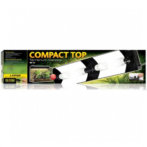 O Exo Terra Compact Top Canopy é um suporte com lâmpada para terrário projetado para uso com o Exo Terra Glass Terrarium. Este suporte fácil de instalar acomoda lâmpadas fluorescentes compactas ou lâmpadas incandescentes de baixa potência. É possível utilizar uma combinação de diferentes lâmpadas fluorescentes compactas Exo Terra Repti Glo (PT2226 / PT2227 / PT2228) para criar a relação de luz ultravioleta/visual ideal ou uma combinação com uma fonte de luz incandescente, como a lâmpada de calor diurna para aumentar a temperatura ambiente. Acessórios opcionais, como o Exo Terra Digital Thermometer e o Hygrometer e o Exo Terra Thermostat e Hygrostat, podem ser inseridos na borda deslizante especial na parte superior da cobertura.