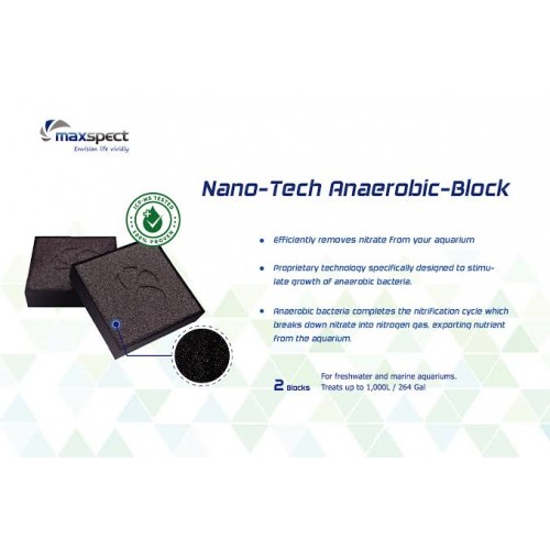 Os blocos anaeróbicos Maxspect Nano Tech são uma inovação que muda o paradigma para "completar o ciclo do nitrogénio" e complementar a sua filtragem. Onde os blocos e esferas originais da Nano Tech se destacam em abrigar bactérias aeróbicas, estes blocos patenteados destacam-se em abrigar bactérias anaeróbicas. O catalisador de desnitrificação fornecido com os blocos aumenta a produção de bactérias dentro da área de superfície massiva e as condições ideais de vida no interior dos blocos.