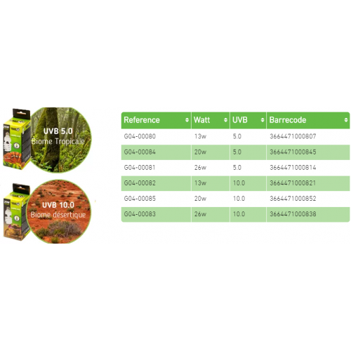 As lâmpadas UVB permitem que os répteis sintetizem a vitamina D3, essencial para a absorção do cálcio. Esta lâmpada (índice 5.0) é adequada para espécies tropicais e 10.0 para espécies desérticas.