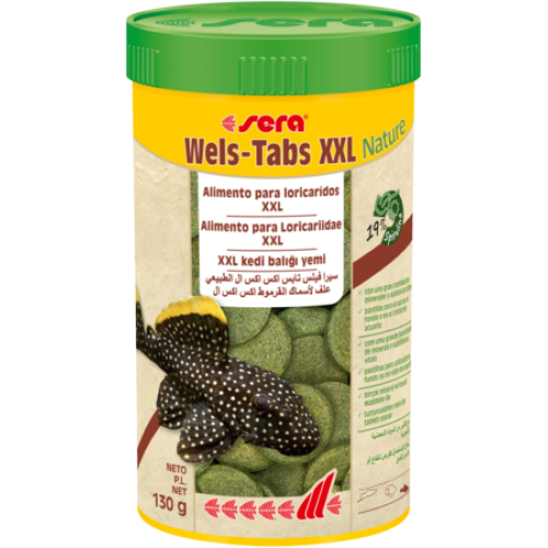sera Wels-Tabs XXL Nature é o alimento base sem corantes nem conservantes para Loricariidae de grande tamanho (p. ex. plecos) e outros peixes do fundo. As pastilhas grandes também se podem fixar no vidro do aquário. Este tipo de alimentação proporciona possibilidades fascinantes para observar as diferentes espécies de peixes ornamentais.