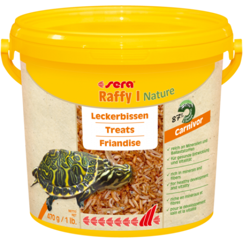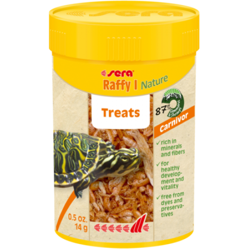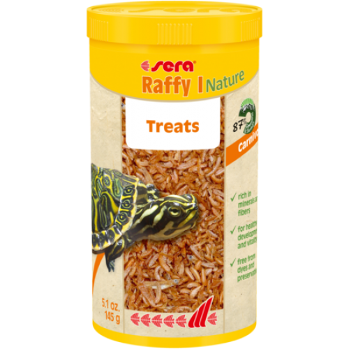 sera Raffy I Nature é o petisco, sem corantes nem conservantes, composto por gammarus (43,5 %) naturais, cuidadosamente secos, camarões (43,5 %), pequenos peixes e krill, para tartarugas aquáticas e outros pequenos répteis (ocasionalmente) carnívoros e anfíbios.