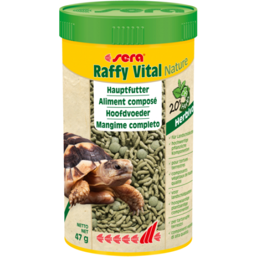 sera Raffy Vital Nature é o alimento base, sem corantes nem conservantes, composto por sticks e pastilhas de ervas cuidadosamente processados, para tartarugas terrestres e todos os outros répteis herbívoros.