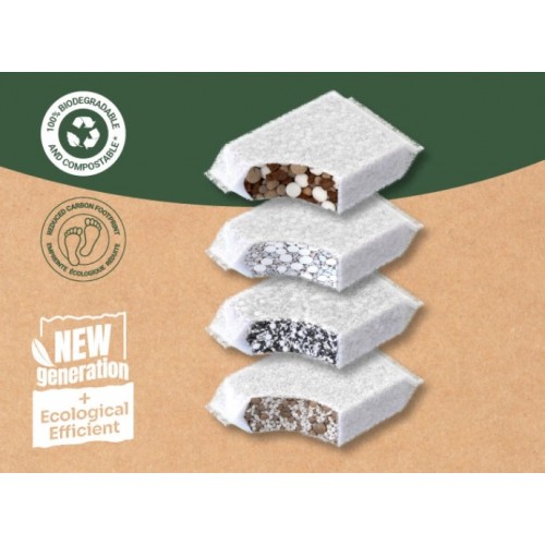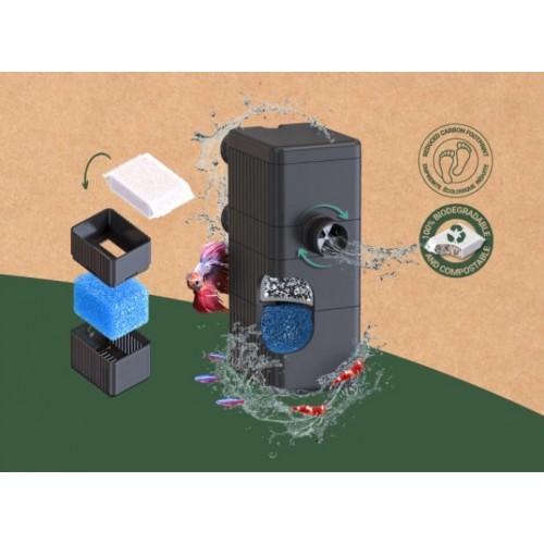 A característica mais revolucionária e inovadora deste filtro é o material biodegradável que envolve as novas recargas filtrantes B-BOX. Um revestimento não poluente, livre de plásticos, e que pode ser eliminado no lixo orgânico, seguindo posteriormente para compostagem. Após a sua utilização, basta retirar os filtros do aquário, compostar e deixar a natureza fazer o resto. Os materiais que compõem as recargas Bact Life, Cleanwater e Pure Water podem, ainda, ser reutilizadas como substratos para plantas, ganhando assim uma nova utilidade.