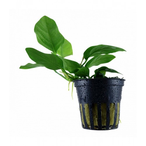 É originária dos Camarões e atingirá 5-10 cm de altura. O rizoma terá 10-15 cm ou mais. Cresce lentamente e as folhas sobrevivem por vários anos, dando às algas de crescimento lento a chance de se estabelecerem. O melhor resultado é obtido plantando em uma pedra ou raiz de árvore. Linha de pesca pode ser usada para prender a planta até que ela se segure. Se plantado no fundo, o rizoma não deve ser coberto, pois tende a apodrecer.