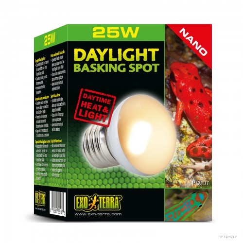 A Daylight Basking Spot é uma lâmpada de calor radiante com revestimento de neodímio. O espectro de luz é ideal para criar um ciclo de luz diurno, estimular a fotossíntese das plantas e a luz infravermelha contribui para o bem-estar fisiológico dos répteis. O local permite direcionar o calor para criar um local de aquecimento e um gradiente de temperatura no terrário.