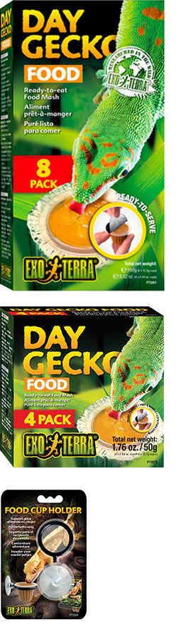 O Exo Terra Day Gecko Food é uma mistura de alimentos nutritivos que é especialmente concebida para o crescimento e saúde a longo prazo das Gecko diurnos e outras espécies de Geckos. Na natureza, os Day Geckos alimentam-se de insetos, frutas maduras, néctar e pólen. Devido à sua dieta variada, uma combinação de frutas naturais e quantidades apropriadas de proteína foi misturada para criar uma dieta saudável com uma textura, sabor e aroma desejáveis ​​para aceitação máxima. The Day Gecko Food contém todas as vitaminas essenciais, aminoácidos e oligoelementos necessários para manter o seu réptil de estimação feliz e saudável. Cada copo fornece a quantidade ideal de alimento para os seus Geckos, o que impede que se estrague e evita que os geckos espalhem os alimentos por todo o terrário. Os copos encaixam-se perfeitamente em itens decorativos, como o ornamento Exo Terra Multi-funcional Bamboo ou o Canopy Combo Dish.